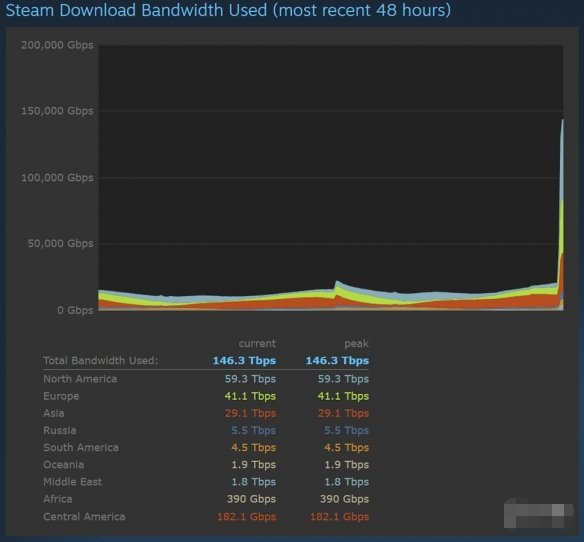 《博德之门3》的大小为122GB,据Steam统计页面显示,昨晚全球宽带使用峰值超过146Tbps,这几乎是《赛博朋克2077》上线时在Steam上负载的三倍。