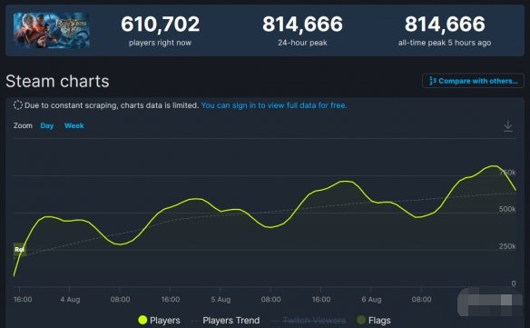 《博德之门3》正式版在发售首周周末不断刷新在线人数纪录,据SteamDB显示《博德之门3》Steam同时在线人数已破81万,具体为814666人,这一数字在8月6日晚达成,相比8月5日又涨了10万多人,实属恐怖。