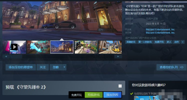 《守望先锋2》steam页面今日开启预载,本体免费可直接入库下载,支持简体中文,硬盘需要50gb空间。