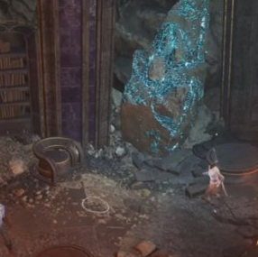 1、我们来到幽暗地域古代熔炉左下方岩浆旁的平台上,能够找到一块秘银矿石,击碎后就能获得。