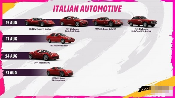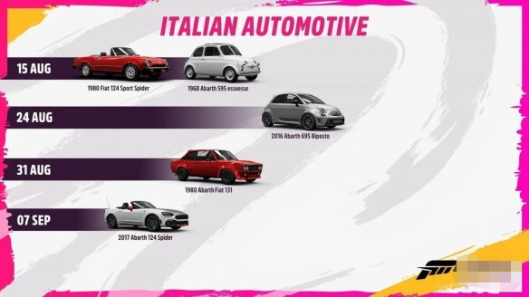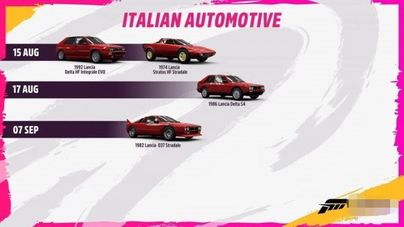 Playground Games宣布,《极限竞速:地平线5》将推出意大利汽车补充包,补充包内包括阿尔法罗密欧、菲亚特、蓝旗亚、阿巴斯等知名意大利汽车品牌的多款车型。如图所示: