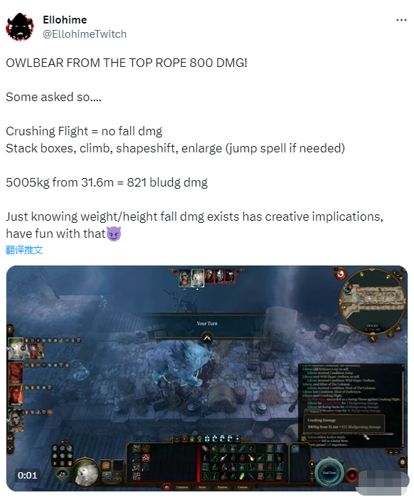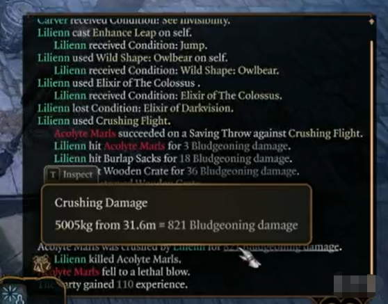 然而,《博德之门3》存在一个有趣的机制,即每个物体皆有「重量」,除了高度会影响坠落的伤害,重量也会影响。遇上主播 Ellohime 做出了尝试:他利用箱子叠加高度,变身成枭熊,再施展巨大术让体型变得更大,然后施展粉碎飞行技能,以 5005kg 的重量从 31.6m 压下攻击敌人。