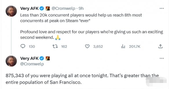 《博德之门3》在8月13日(周末)晚上再次刷新了Steam同时在线人数纪录,为875343人,拉瑞安工作室发行总监(推特网名Cromwelp)发文感谢玩家,并表示这一数字比旧金山的总人口还要多。