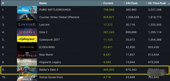 据SteamDB显示目前第8名是《霍格沃茨之遗产》,其Steam同时在线人数纪录为879308,《博德之门3》已经非常接近了。