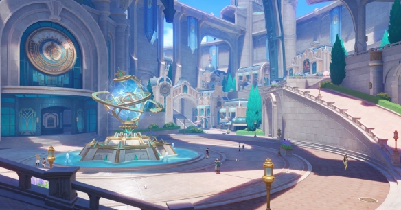 枫丹的主城区域「枫丹廷」内既有精致优雅的上城区,也有充满着生活气息的居民区,繁忙的街道上都是衣着讲究的行人、生物以及巡逻的发条机关。