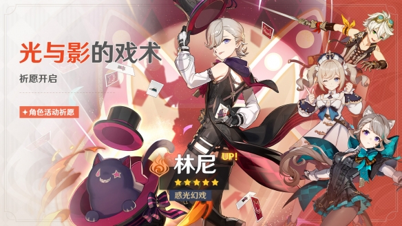 4.0版本更新后至2023年9月5日17:59,角色活动祈愿-1「光与影的戏术」与角色活动祈愿-2「素霓伣天」开启,全新限定五星角色「惑光幻戏·林尼(火)」与限定五星角色「兰生幽谷·夜兰(水)」迎来概率UP。全新四星角色「丽影绮行·琳妮特(风)」会在角色活动祈愿-1「光与影的戏术」、角色活动祈愿-2「素霓伣天」中迎来概率UP。