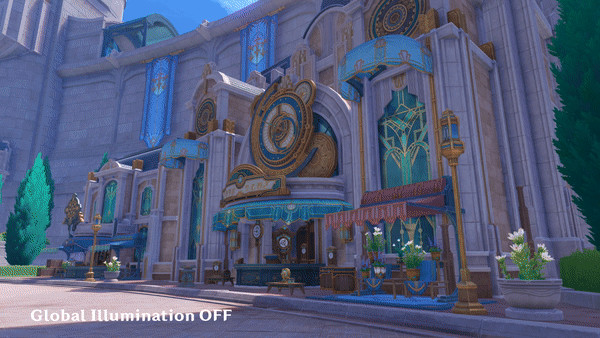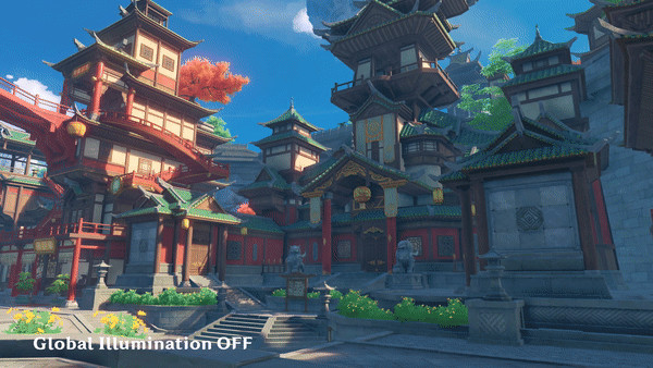 为了进一步提升照明效果的真实感,新版本将在部分区域导入全新功能「全局照明」(GI)。GI的一个关键部分是间接照明,即表现光线是如何在表面上进行反射和散射。与仅有唯一光源的直接照明不同,GI可以使物体 (特别是它们的颜色)受到来自周围物体多条间接光线的影响。例如:启用GI后,墙壁、窗户或其他建筑部分可能会受到附近红色瓦片的间接光线影响,从而产生带有微红色调、更柔和且更自然的阴影。