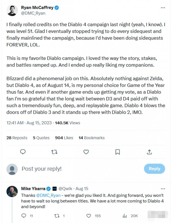 IGN 编辑 Ryan McCaffrey 在其X 平台上发文分享了自己的《暗黑破坏神4》感受,并称截止目前《暗黑破坏神4》是其个人认为的年度游戏,《暗黑破坏神3》到《暗黑破坏神4》之间的漫长等待也得到了回报。