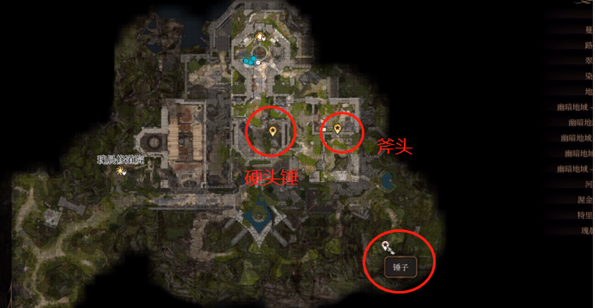 2、然后右侧的石台放置锤子,后面放硬头的锤子,然后左侧要放战斧。