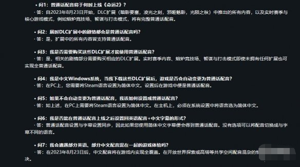 普通话配音所覆盖的DLC有暗影要塞、凌光之刻、邪姬魅影和光陨之秋。不仅如此,实时赛季和核心游戏模式如:熔炉竞技场、智谋与打击模式也将得到完整的普通话配音支持。