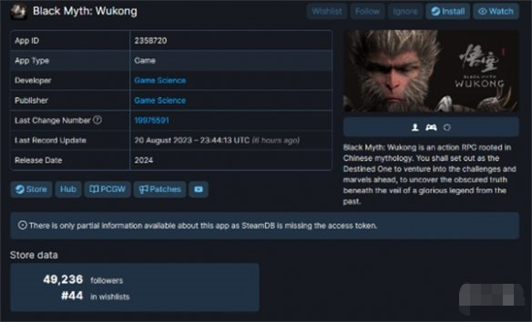 《黑神话:悟空(BLACK MYTH WU KONG)》已上线Steam页面,玩家可添加至愿望单或关注。据SteamDB数据显示,该游戏目前已有49236玩家关注,位列愿望单中第44名。