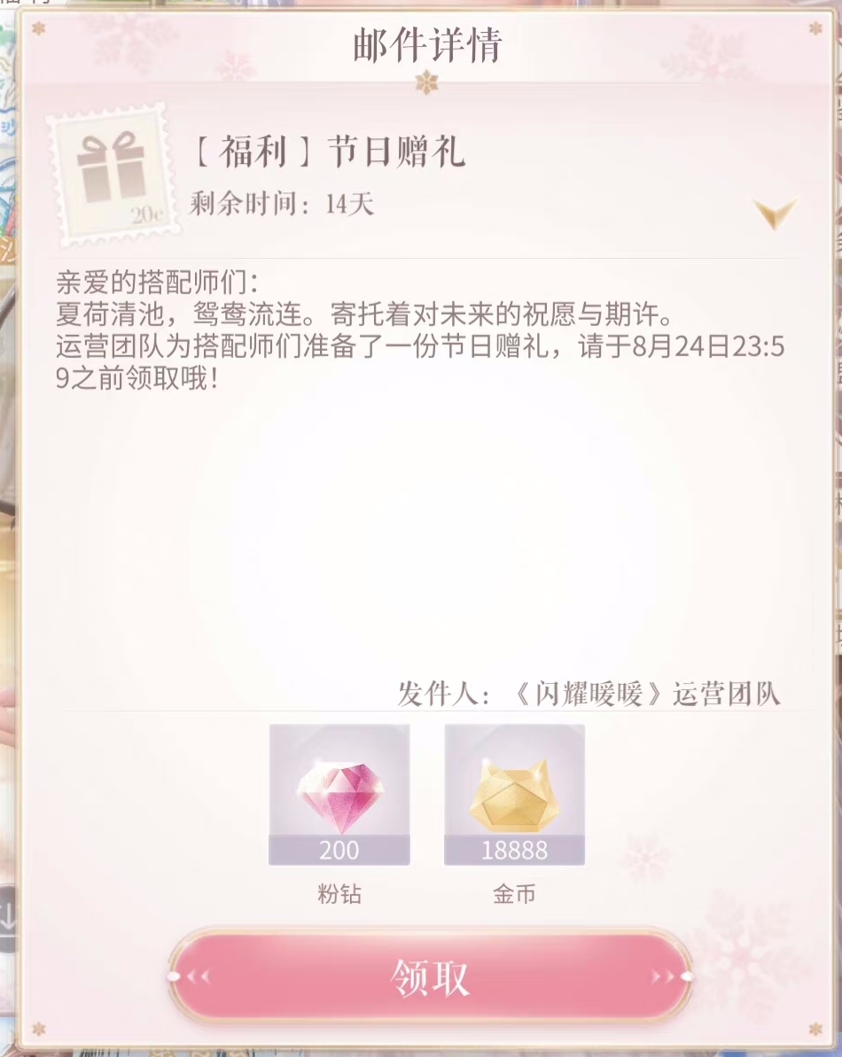 大家注意啦!8月22日5:00~8月24日23:59期间,登录游戏就可以领取节日赠礼邮件,内含【粉钻*200+金币*18888】。赶紧上线领取吧!祝大家七夕佳节快乐!