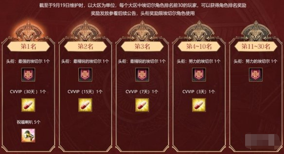 在8月22日新版本上线的同时,当然还有多重福利活动等待英雄们参与进来啦!首先是埃切尔角色的排名活动,在9月19日维护时,每个大区中埃切尔角色排名前30的英雄,可以获得排名奖励!当然,换装间排名前10的英雄,同样也可以获得对应的奖励!