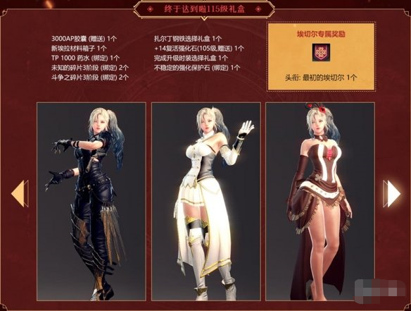 在体验新角色的同时,升级提升战力可谓是首要事项!而在8月22日维护后至9月26日维护前,勤勤恳恳的升级活动开启,新创建的角色或30级以下的角色可以从邮箱中获得“开始升级礼盒”,此后每升级至指定等级,即可开启对应的礼盒并且获得下一等级的礼盒,除了礼盒中的奖励外,埃切尔角色还会额外获得专属道具奖励!