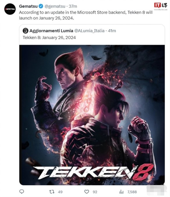 近日,据外媒Gematsu报道,微软商店后台更新了《铁拳8(Tekken 8)》的发售日期,于2024年1月26日发售。据报道,该游戏将在2023年科隆游戏展上亮相,官方也许会在活动上正式宣布该游戏的发售日期。2023科隆游戏展开幕夜将于明日(8月23日)凌晨2点直播。