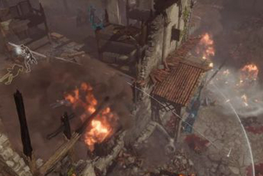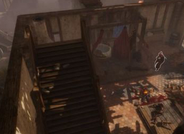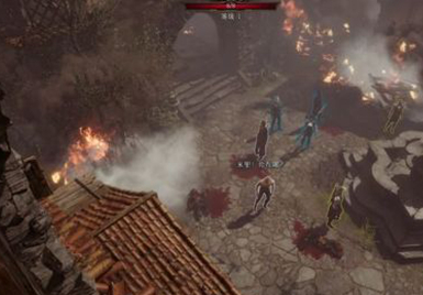 1、我们先来到染疫村落西北方,这里有一个旅馆,不过现在在着火。上楼后就有一个蓝色的门。