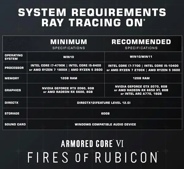 《装甲核心6》的配置要求,取决于玩家是否要打开光追游玩。