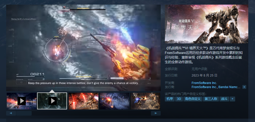目前Steam上已经开启《装甲核心6 境界天火》的预购啦,标准版价格298元、豪华版价格348元,游戏不仅支持中文,参与预购还会有特典奖励,其中豪华版的《装甲核心6》还包含限定数字美术集和原声带喔,感兴趣的玩家抓紧时间购入吧!