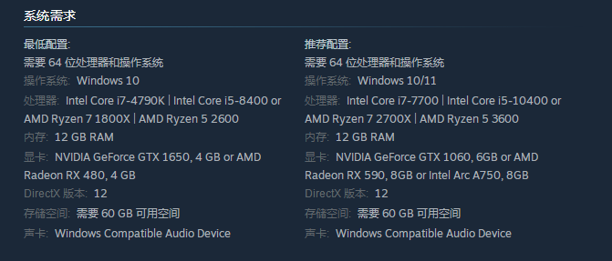 显卡推荐选择GTX 1060(6GB)RX 590(8GB)或Arc A750(8GB),推荐硬盘空间60GB。