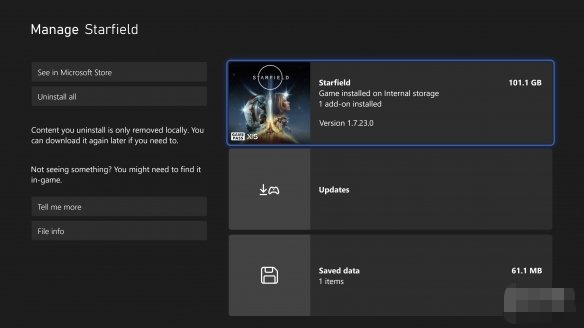 Xbox游戏新闻推主Idle Sloth透露,B社《星空》的首日补丁 (v.1.7.23.0)现已更新,PC版补丁大小为13.4GB,XSX版为15.48GB,《星空》XSX版总容量大小为101.1GB。