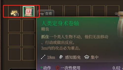 1.首先我们通过潜行来到他的背后,避开视野之后偷窃就可以了,能拿到13个金币和1个定身卷轴。