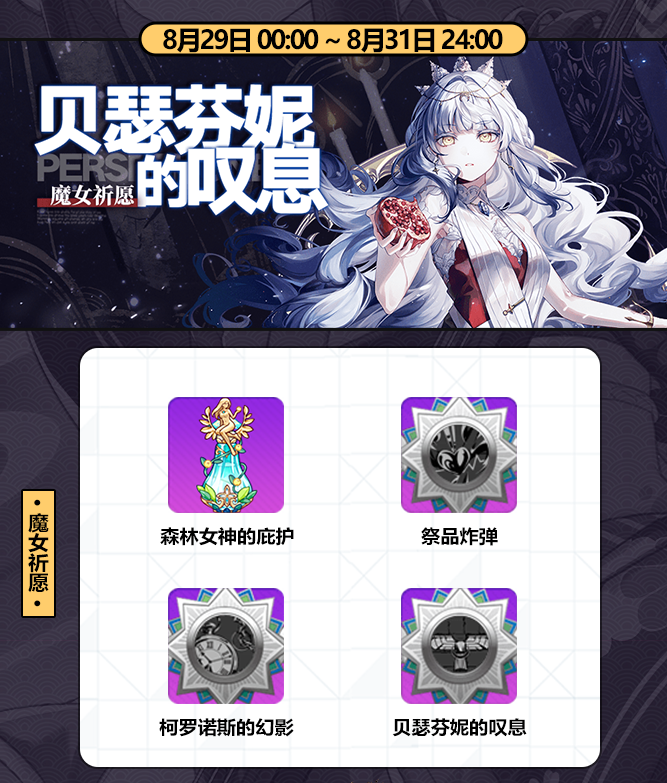 本期UP武器:贝瑟芬妮的叹息、森林女神的庇护、祭品炸弹、柯罗诺斯的幻影