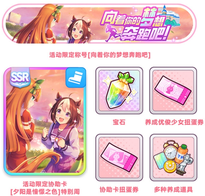训练员参与活动还能获得超多宝石、SSR限定协助卡、活动限定称号。