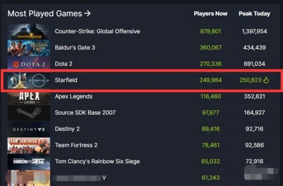 B社开放世界科幻RPG大作《星空》已于北京时间今日上午8点全球解锁,相信不少网友都玩了吧!这款游戏此前在抢先体验阶段就非常的火热,而现在,根据SteamDB的数据显示,这款游戏的在线人数峰值已经突破了25万人。