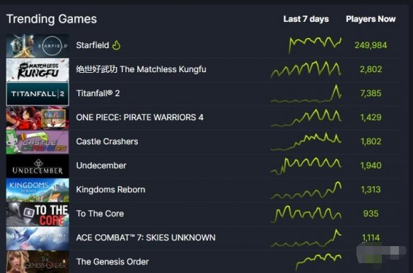 根据SteamDB的最热门游戏榜单显示,《星空》目前的玩家人数为249,984人,在榜单上排名第四,在线人数峰值则突破了25万,达到了250,823人。稍显遗憾的是,《星空》依然不敌前段时间大火的《博得之门3》,后者的在线人数为360,067人。