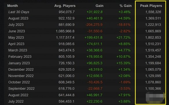 据SteamChart显示,《CS:GO》过去一年来(2022年8月~2023年8月)每个月的Steam在线人数峰值都超过了100万,V社宣布《CS2》后,今年5月份《CS:GO》更是破纪录的达到180万人同时在线。要知道《CS:GO》于2012年8月发售,这款在11年前推出的游戏依然生命力顽强,《CS:GO》毋庸置疑是Steam上的最热门游戏。