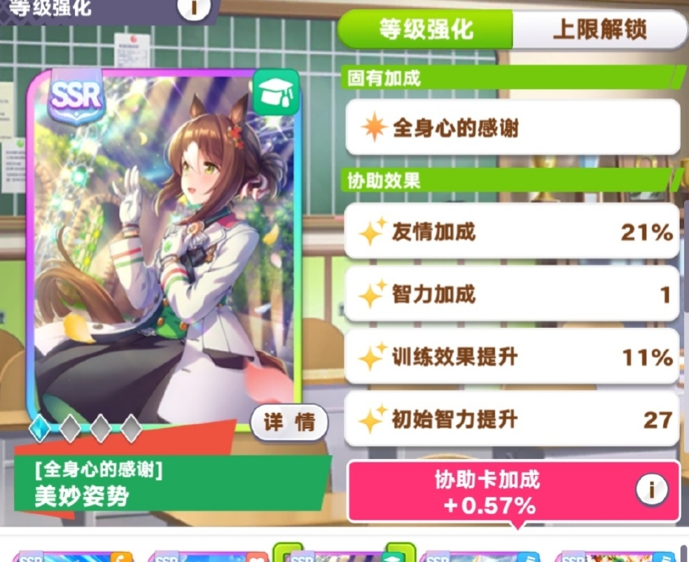 2、美妙姿势作为【智力】属性的协助卡,虽然在目前开服版本的URA大赛上并不算人权卡,但是根据闪耀优俊少女非国服的经验,开服协助卡美妙姿势在往后的游戏版本中,不仅没有被版本淘汰,反而升级为T0的协助卡,所以非常保值才推荐训练员抽。