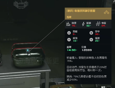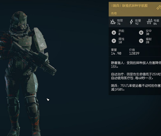 1、我们可以看到异兽猎人这个宇航服是传奇品质的,他一共有三个技能。