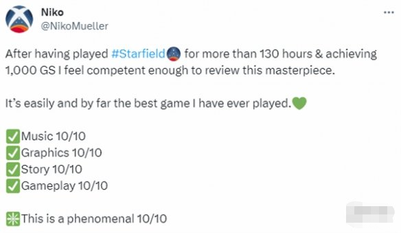 在Niko Mueller达成《星空》全成就后,为该游戏打出了10分满分评价,他认为该游戏的音效、图形、剧情、玩法等方面表现都是满分。