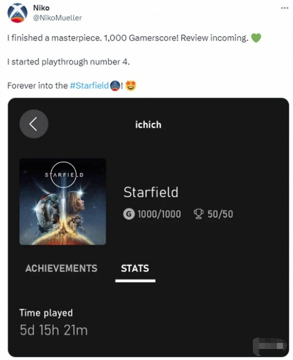 今日,Xbox玩家@Niko Mueller发文称,自己达成了《星空(Starfield)》全成就,一共花费了5天15小时(共计135小时)。《星空》Xbox版共有50项成就,1000成就分。