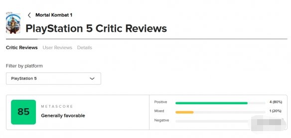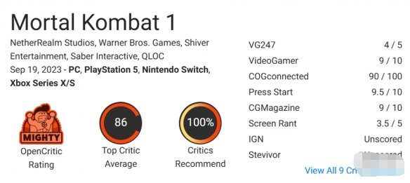 《真人快打》系列重启作《真人快打1》全球媒体评分解禁,截止至本稿发出时《真人快打1》PS5版M站媒体均分 85分(IGN GS等暂未给出评分),Opencritic 媒体均分86分。大多媒体给出好评认为《真人快打1》向前迈进了一步。