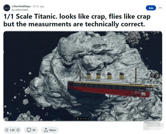 Reddit用户oakensteed在《星空》中通过无限制造船MOD以1:1的比例还原了 泰坦尼克号 ,受到了大量网友点赞,oakensteed表示尽管看起来和飞起来都很垃,但在比例尺寸上应该是正确的。