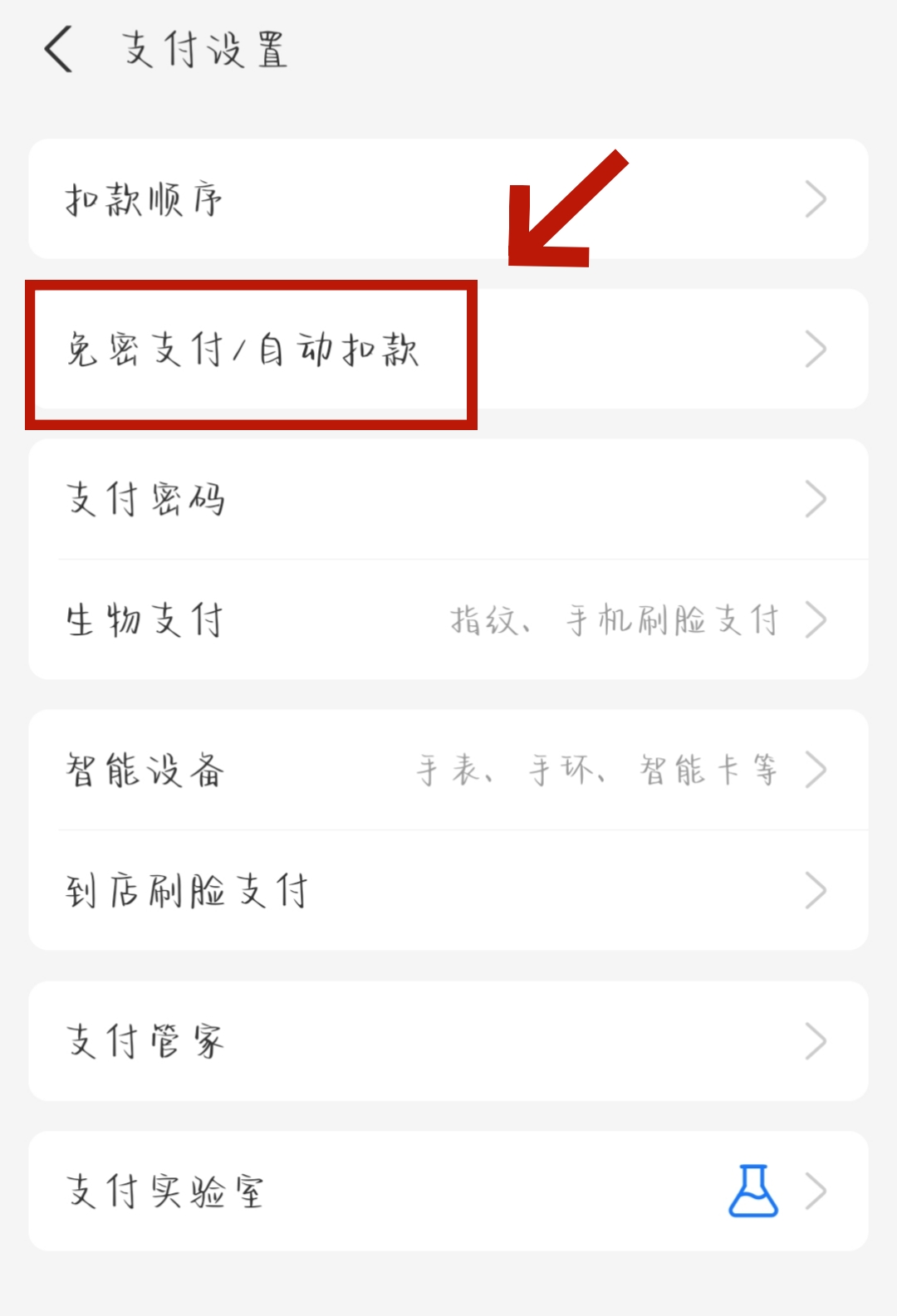 3、进入【支付设置】页面后,我们点击【免密支付/自动扣款】。