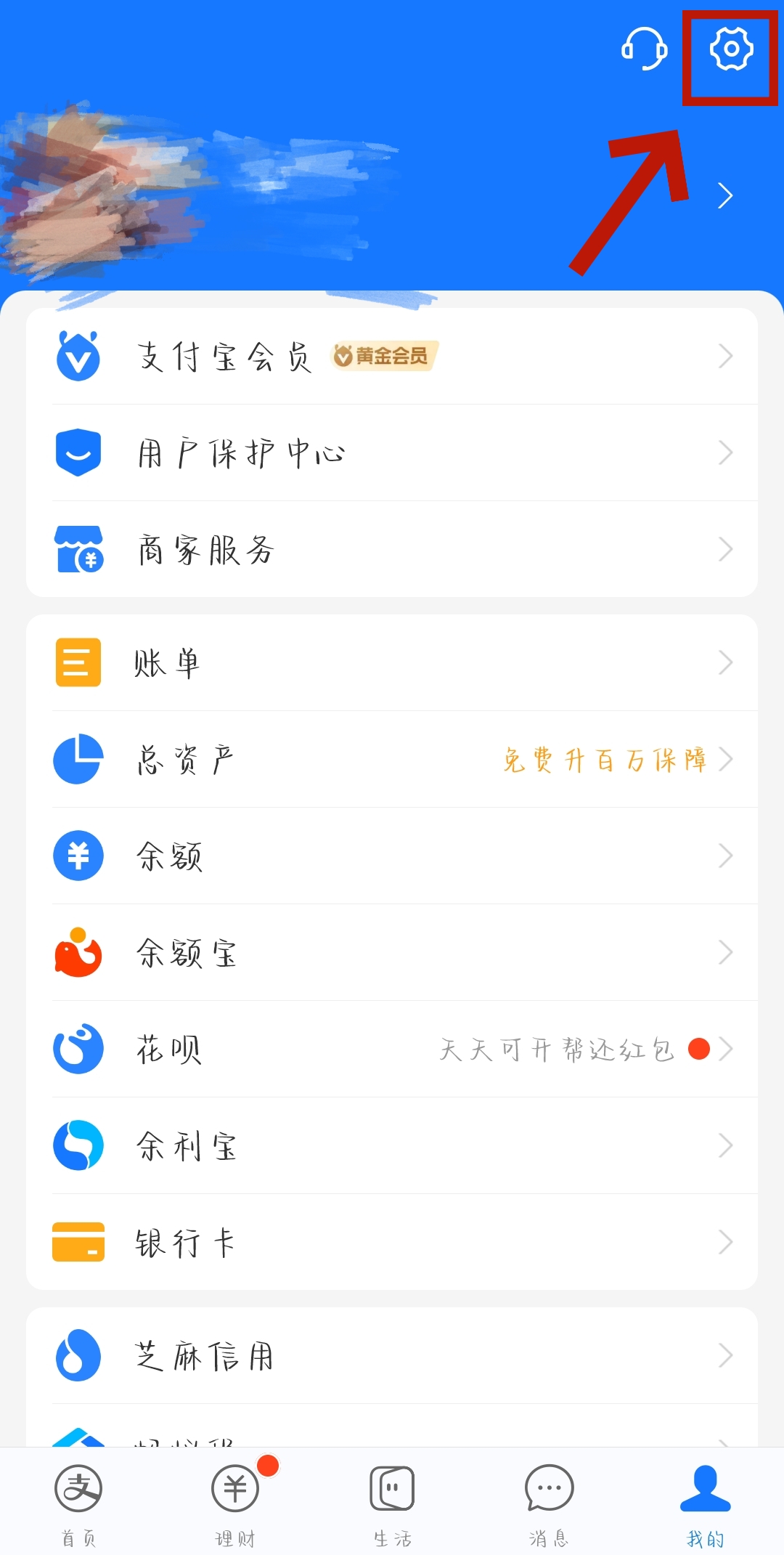 1、首先,我们来到支付宝【我的】页面,再点击右上角的【设置】。
