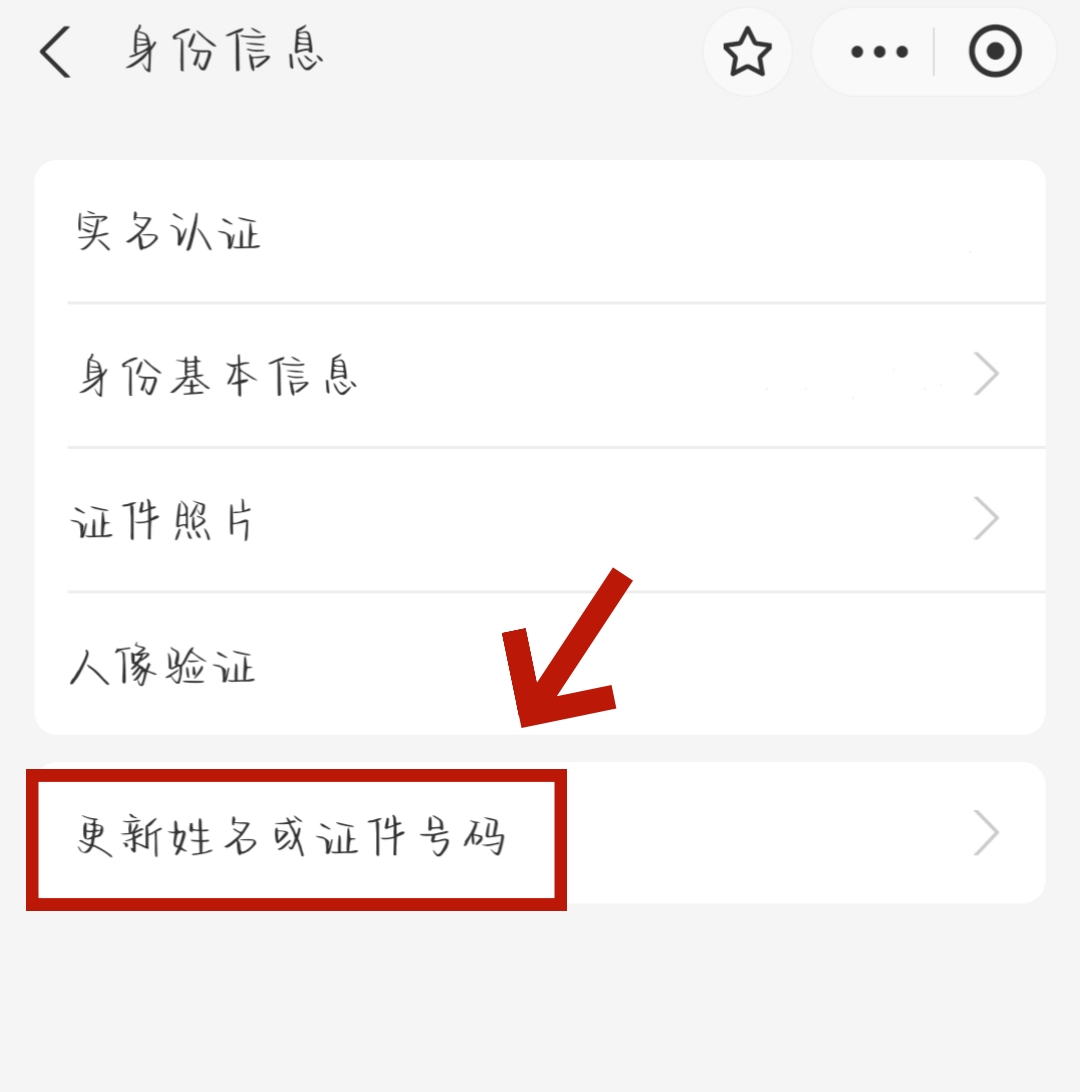 4、进入【身份信息】页面后,我们点击最下面的【更新姓名或证件号码】就可以更改实名认证了。