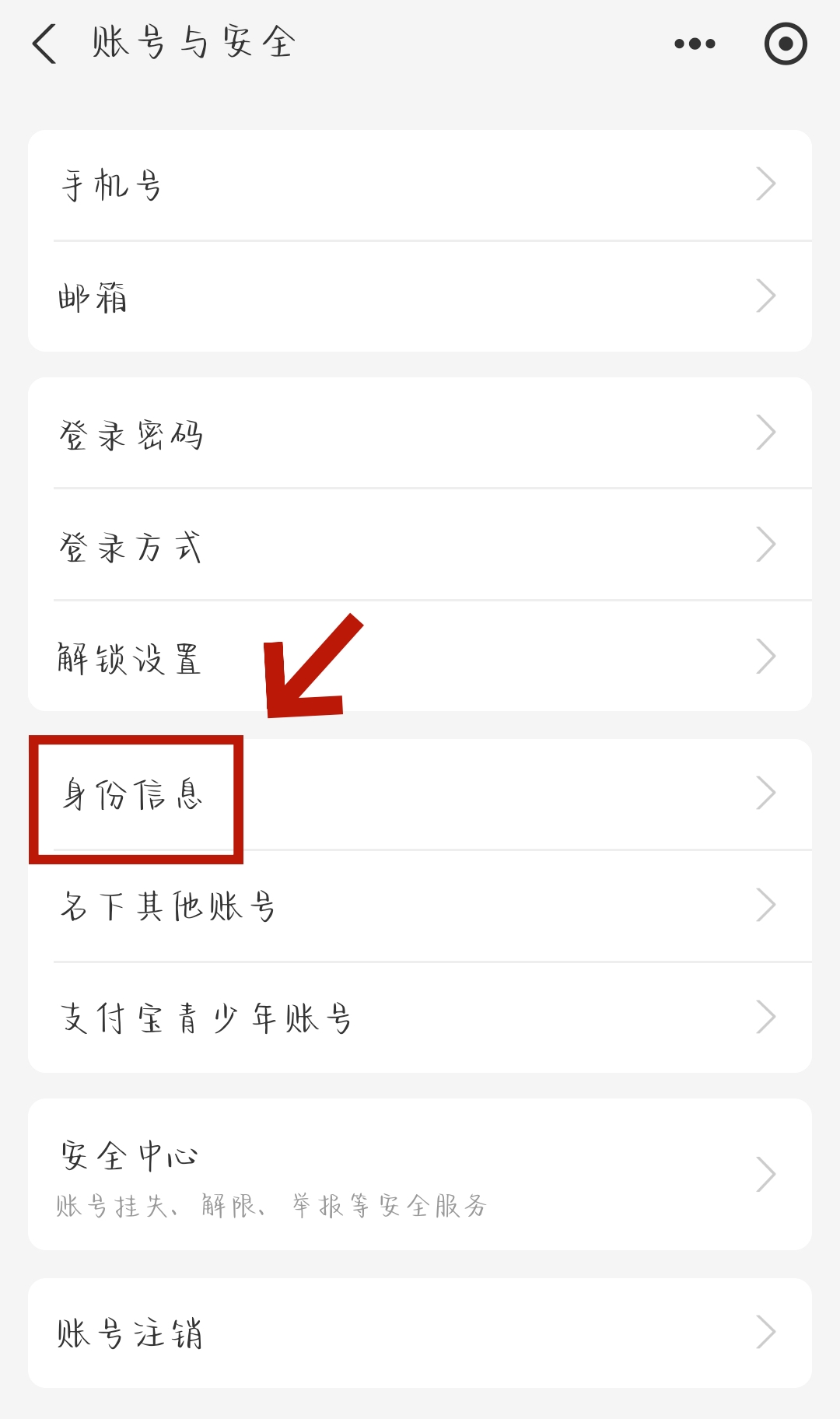 3、进入【账号与安全】页面后,我们点击【身份信息】。