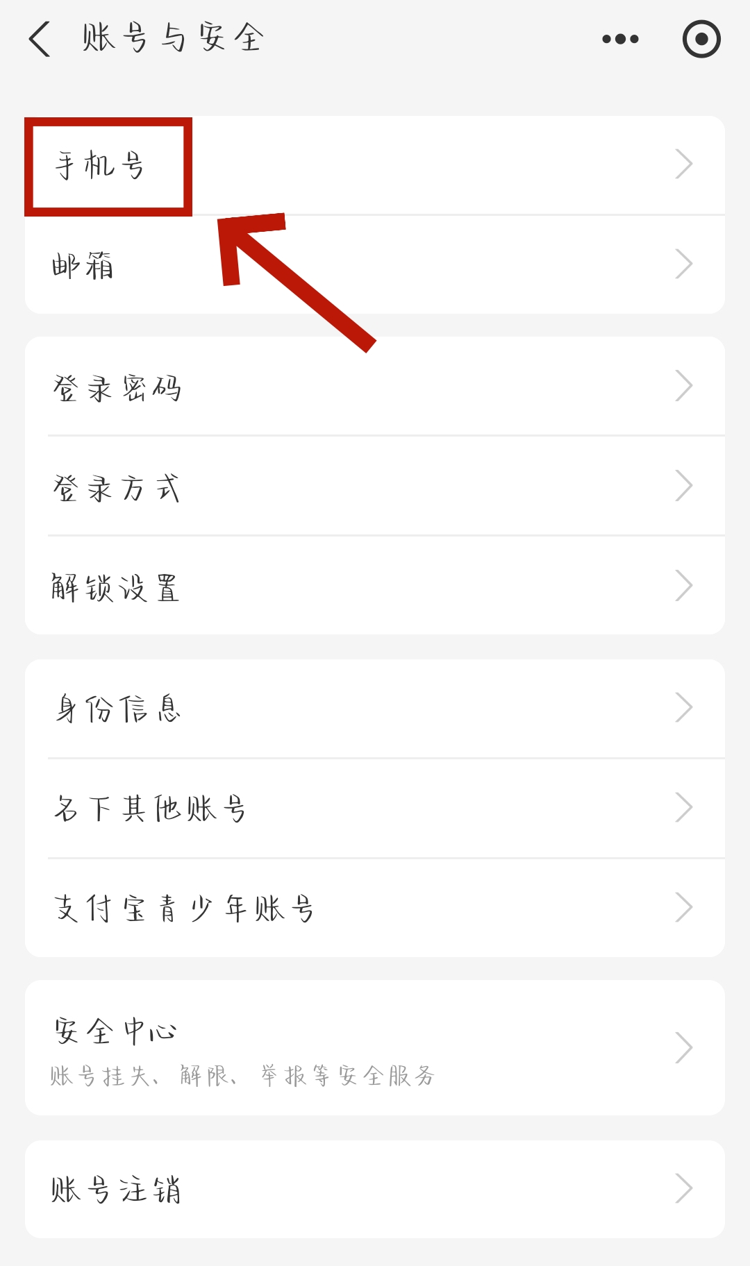 3、进入【账号与安全】页面后,我们点击最上方的【手机号】。