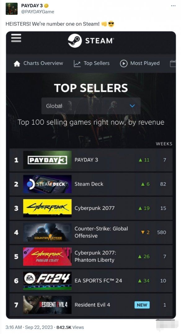 多人合作劫掠射击游戏《收获日3》已在北京时间2023年9月21日23点正式解锁,现已成为Steam全球热销排行榜第一,《收获日3》官方也在推特上庆祝了这一消息。