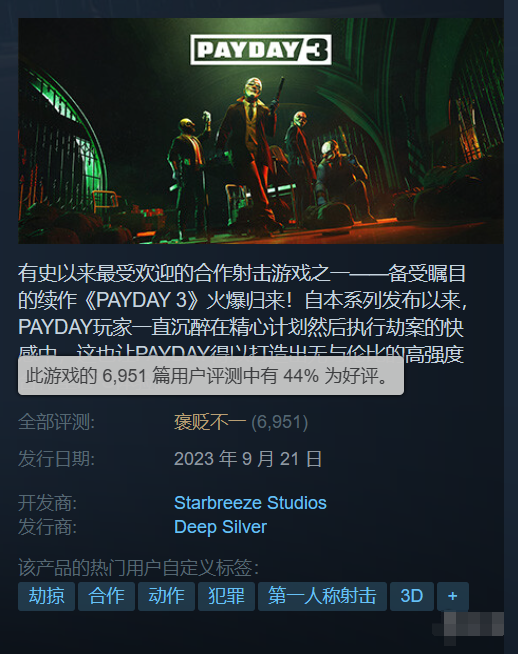 值得一提的是,截止至本稿发出时,《收获日3》在Steam上的评价为“褒贬不一”,评价人数超过近7000,好评率仅有44%,仍在下跌中,大量玩家反映游戏服务器太垃圾导致无法游玩,游戏性也存在问题,有玩家直言不如十年前的《收获日2》好玩。