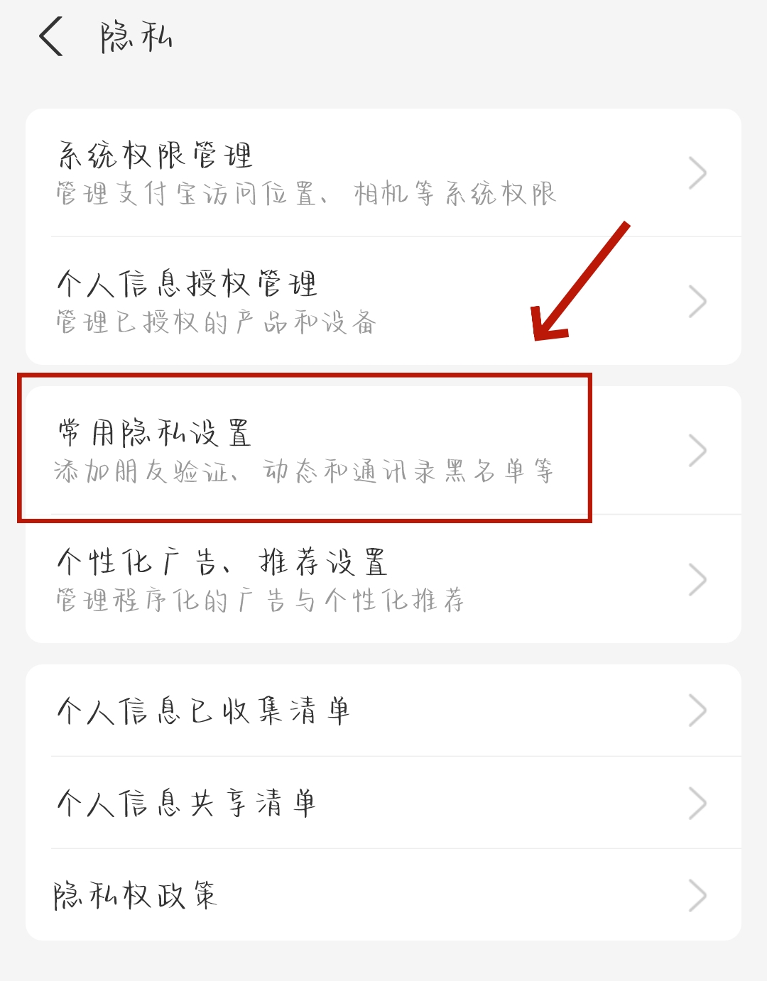 3、在【隐私】页面里,我们点击【常用隐私设置】。