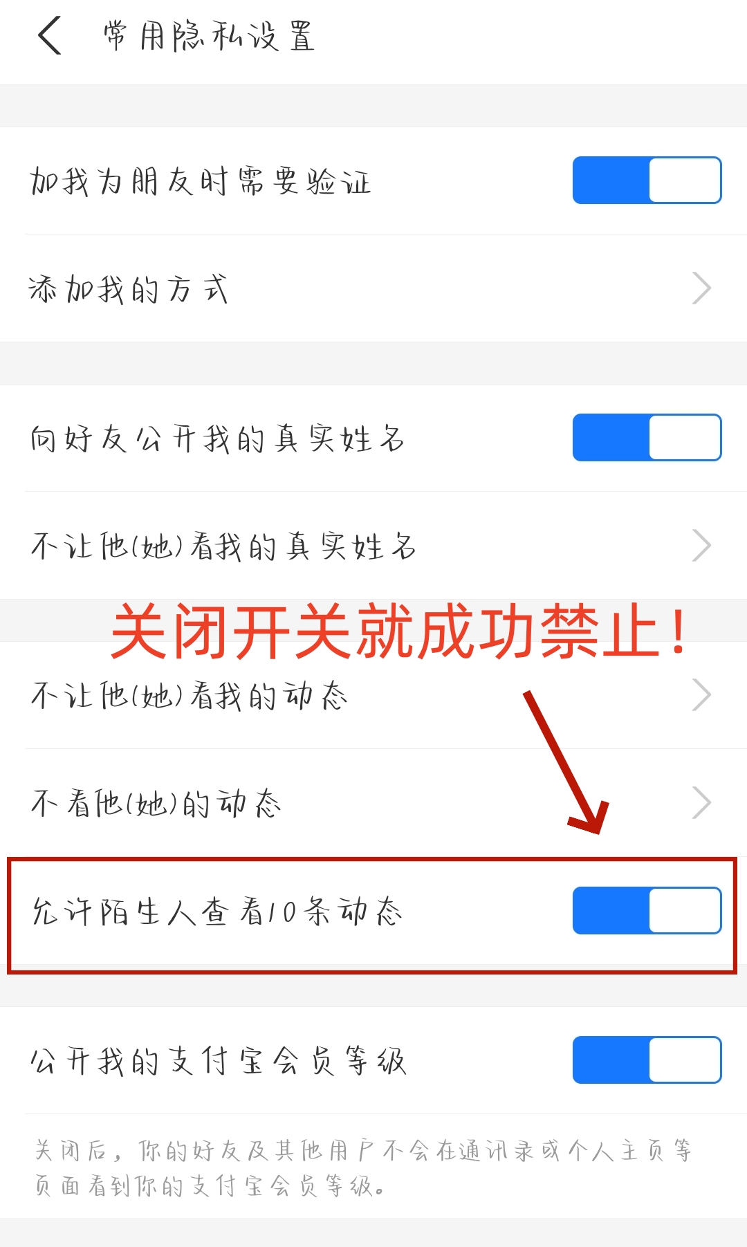 4、点击【常用隐私设置】后,我们就可以看到【允许陌生人查看10条动态】了,将右侧的开关关闭就禁止陌生人看我的动态啦!