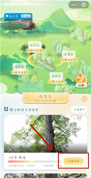 2、在【看古树】页面中,我们点击【支持保护】选择自己想要保护的古树吧。