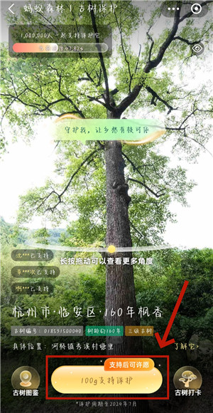 3、现在就可以支持保护古树啦!大家消耗100g能量就可以啦!