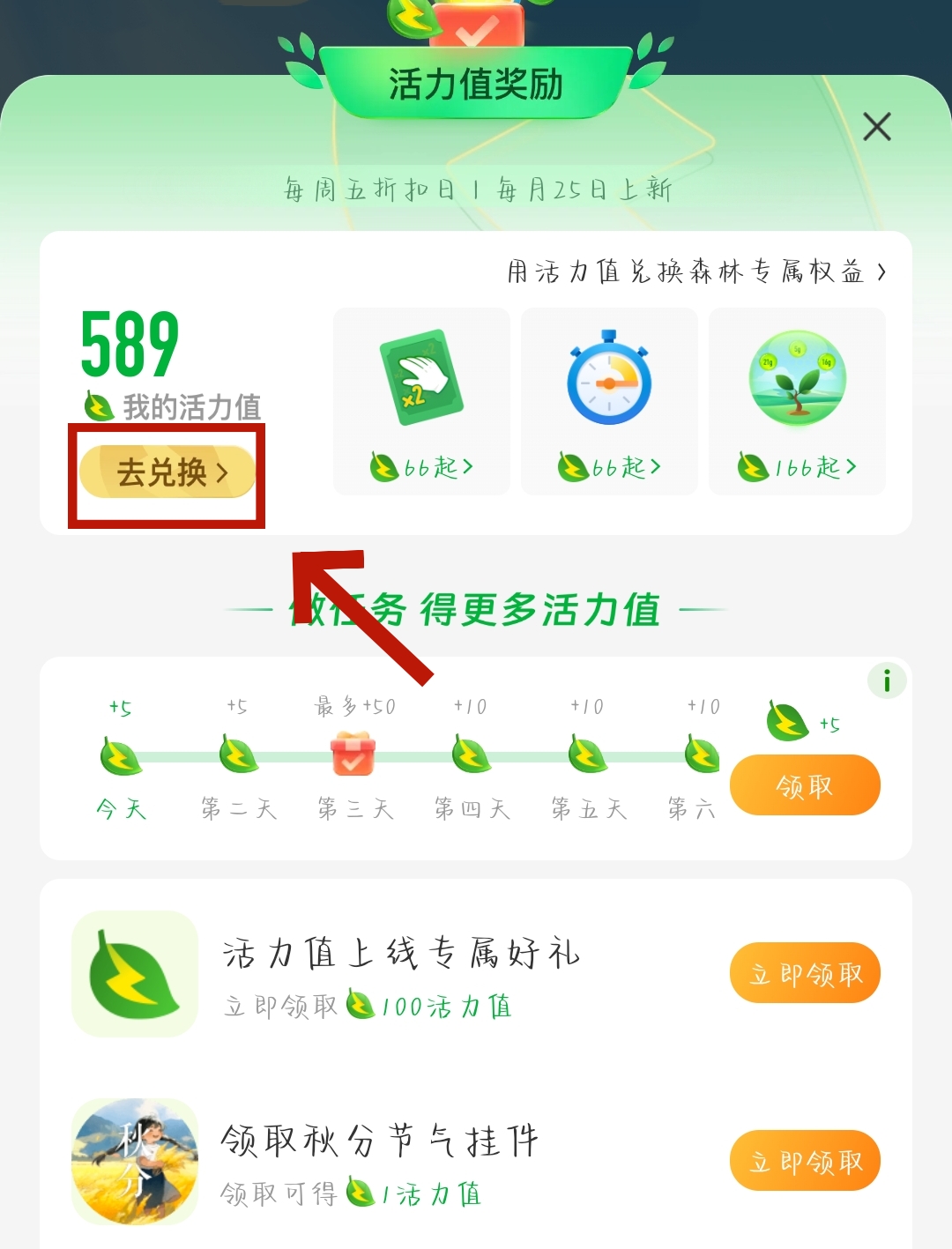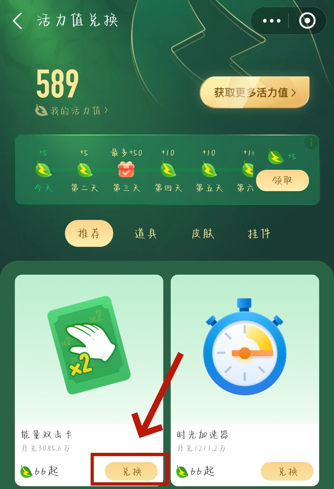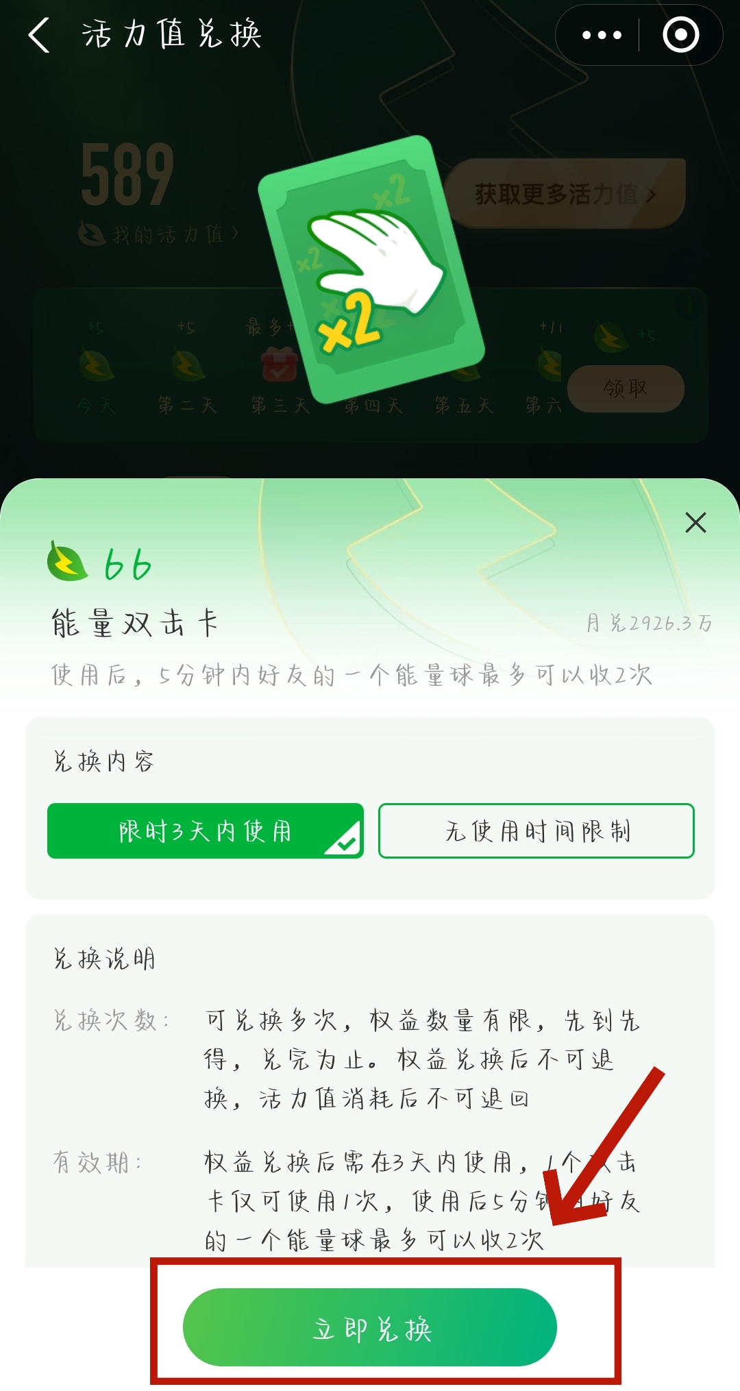 3、进入【活力值兑换】页面,我们点击兑换【能量双击卡】。