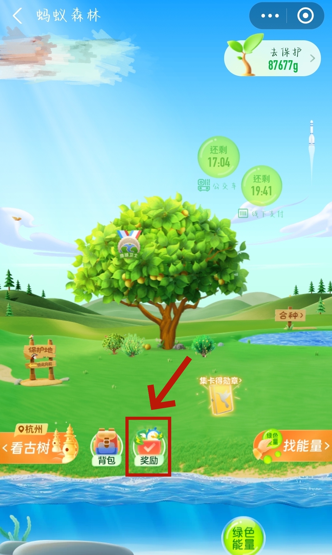 1、首先,我们来到【蚂蚁森林】首页点击【奖励】。