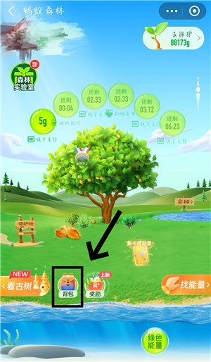 1、我们先来到蚂蚁森林的首页,点击【背包】。